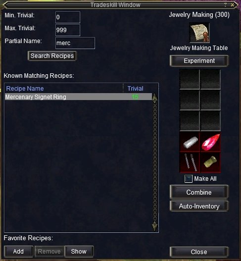 The trivial for the recipe to create Mercenary Signet Ring (for the Mercenary Recruitment task) has been changed to 15. I don't know when it was changed. But it shows up in the jewelry tradeskill window.