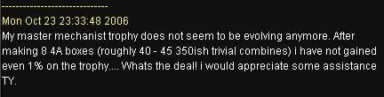 FYI the trophy is in my ammo slot, which is where it has always been. It has evolved in the past there, so i assume unless they Fed something up thats not it. I REALLY don't want to waste combines on this to experiment with it so i'm not going to be doing anymore untill the guild needs more boxes.